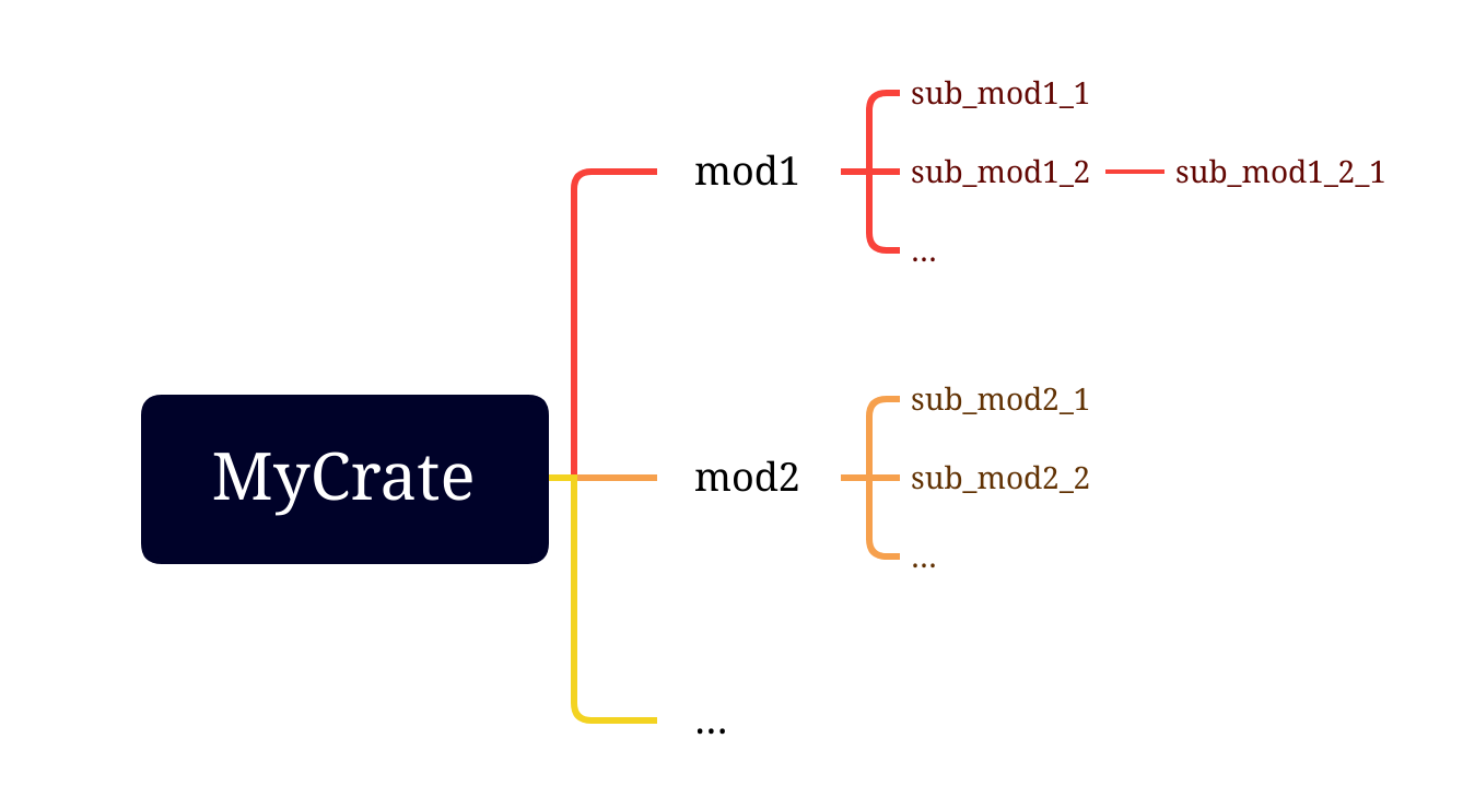submodules: 在除了crate root文件外的其它文件中可以定义子模块, 子模块定义时文件规则和上述查找规则一致. 比如可以再定义一个my_submod子模块(在src/my_submod.rs或src/my_submod/mod.rs文件中). -